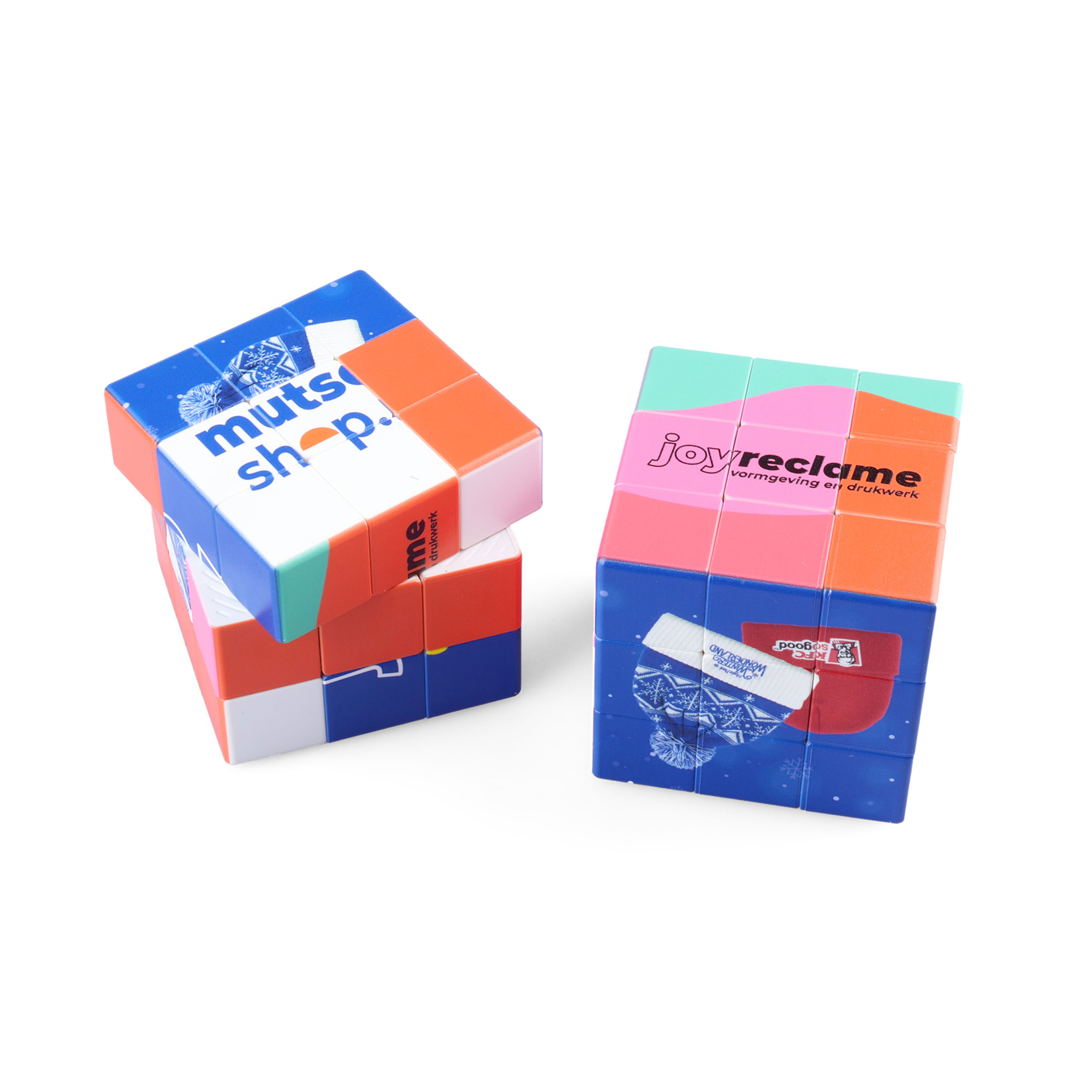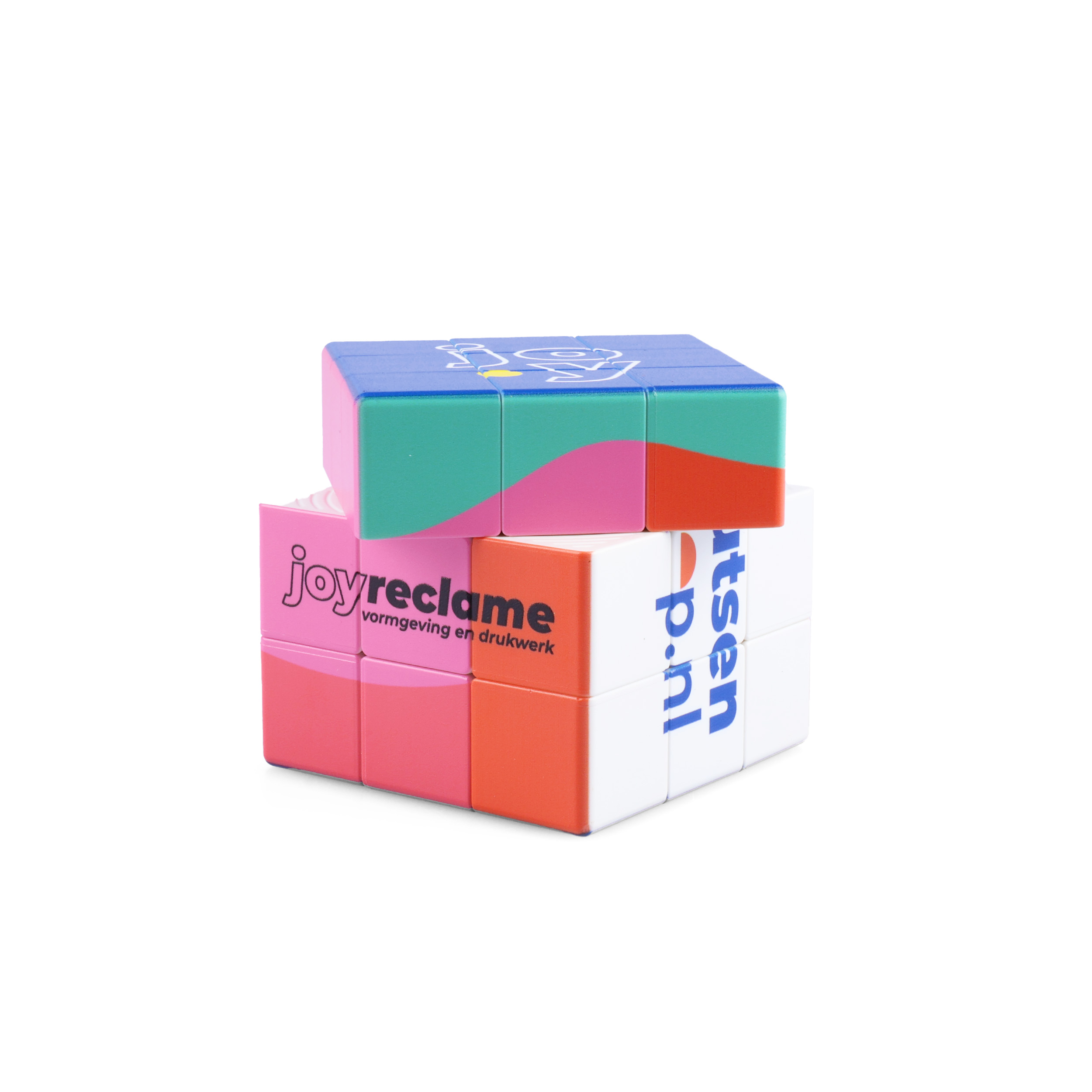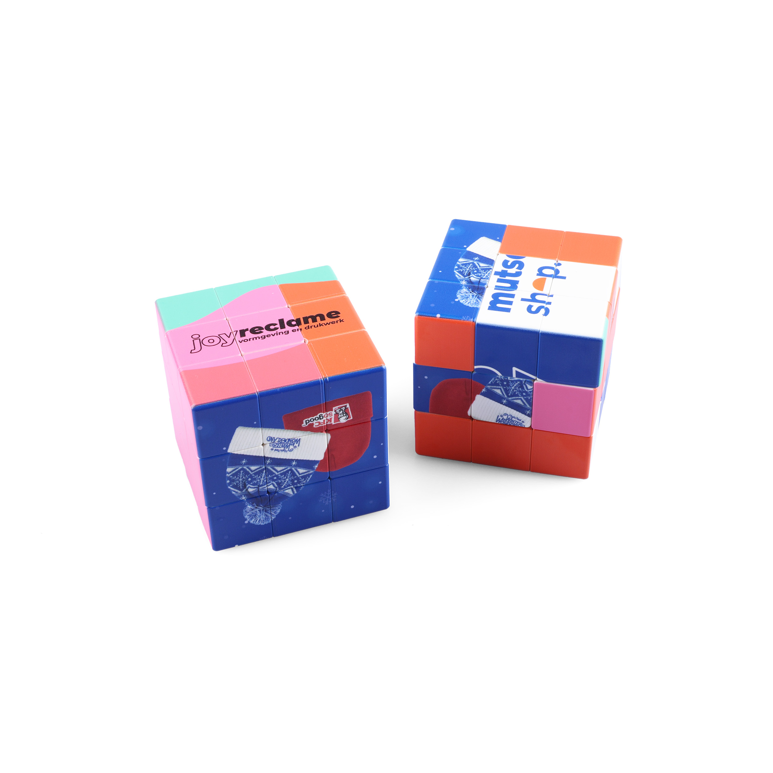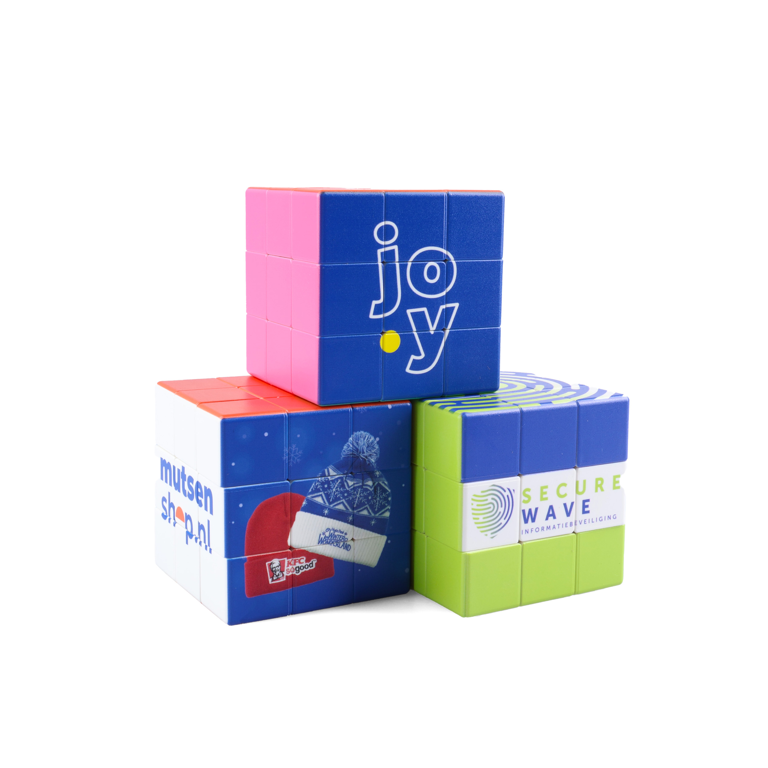 Op zoek naar unieke relatiegeschenken? Met onze 3D draaipuzzels bedrukken (ook wel bekend als 3D draaispel puzzels of bedrukte logische kubuspuzzels) biedt je je klanten of medewerkers iets echt verrassends. Deze puzzels in kubusvorm zijn volledig personaliseerbaar met een haarscherpe full-colour print op alle zijden. Vanaf 100 stuks leveren we uw bedrukte draaipuzzels binnen slechts 17 werkdagen. Ideaal voor promoties, beurzen of als high-end giveaway.