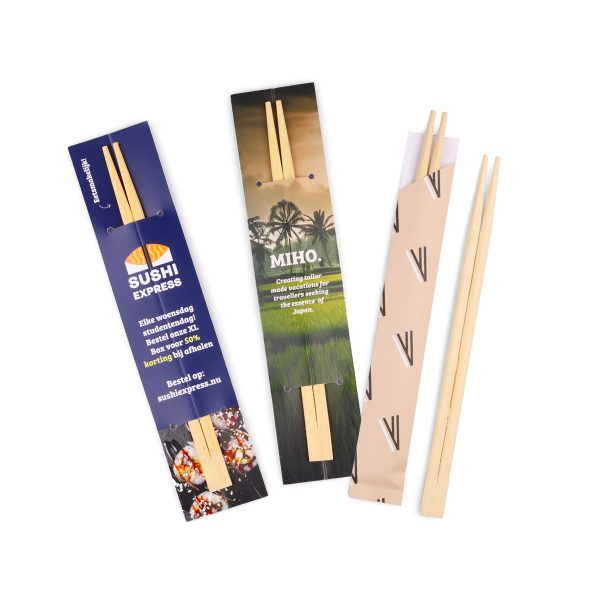 Veel klanten zoeken ook naar chopsticks met logo of bedrukte sushi stokjes. Wat de benaming ook is, wij leveren altijd maatwerk. Bovendien denken wij actief mee over ontwerp, formaat en uitstraling. Zo sluiten de eetstokjes perfect aan bij jouw doelgroep.