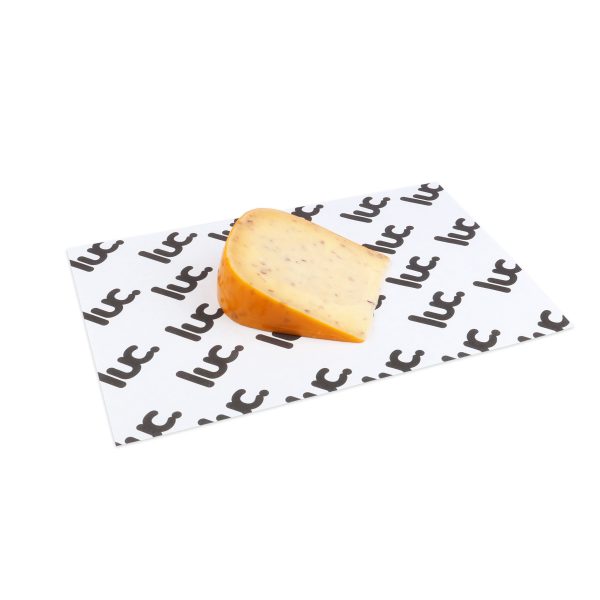 Kaaspapier bedrukken is dé manier om jouw kaasperikelen, worstvarianten of visproducten een professionele uitstraling te geven. Wij bedrukken kaaspapier met jouw eigen logo en design, zodat jouw verpakking direct herkenbaar wordt. Het gaat hier om speciaal vetvrij papier, leverbaar in elke gewenste maat. Het witte, 60 g/m² gecoate papier is geschikt voor full-color bedrukking of in 1 of 2 PMS-kleuren. Omdat het papier aan één zijde gecoat is, is het perfect voor kaas, (droge) worst of bijvoorbeeld vis.
