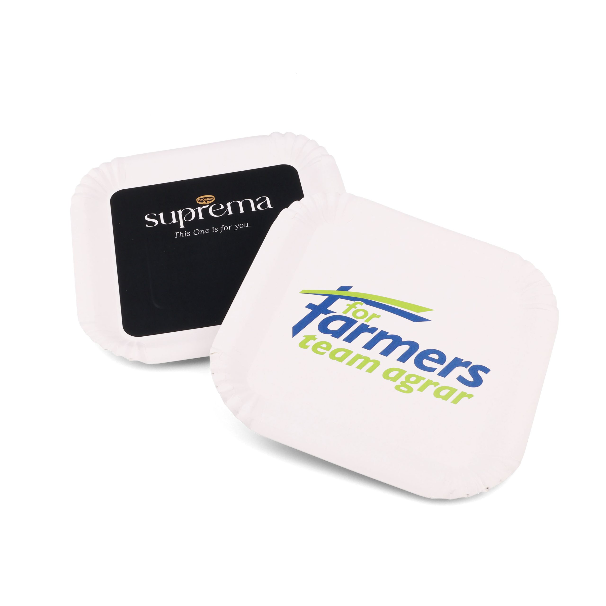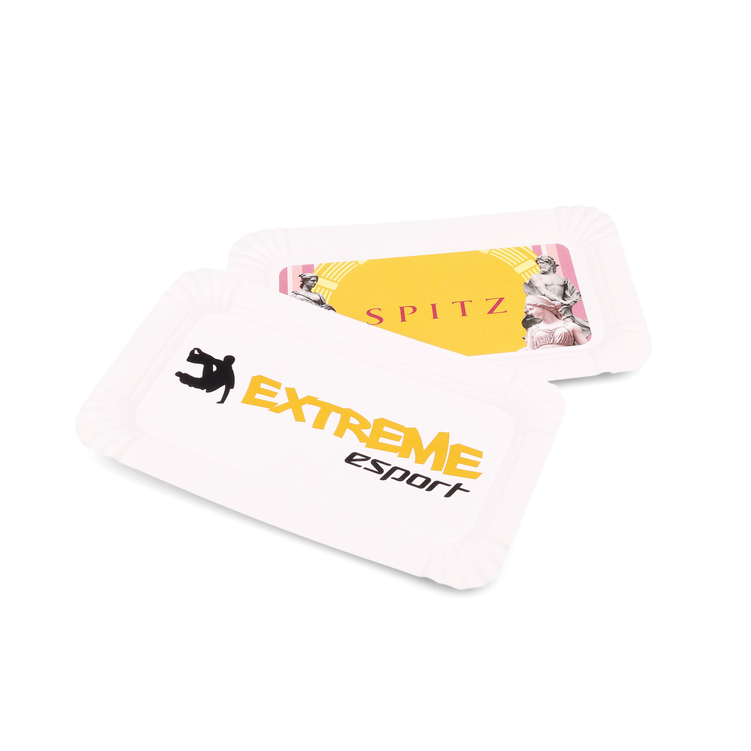 Laat jouw merk opvallen met full-color kartonnen bordjes bedrukt met jouw eigen ontwerp of logo. De borden worden na het bedrukken gestanst in de herkenbare ronde vorm met opstaande rand, waardoor ze niet alleen stevig zijn maar ook een professionele uitstraling hebben.