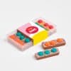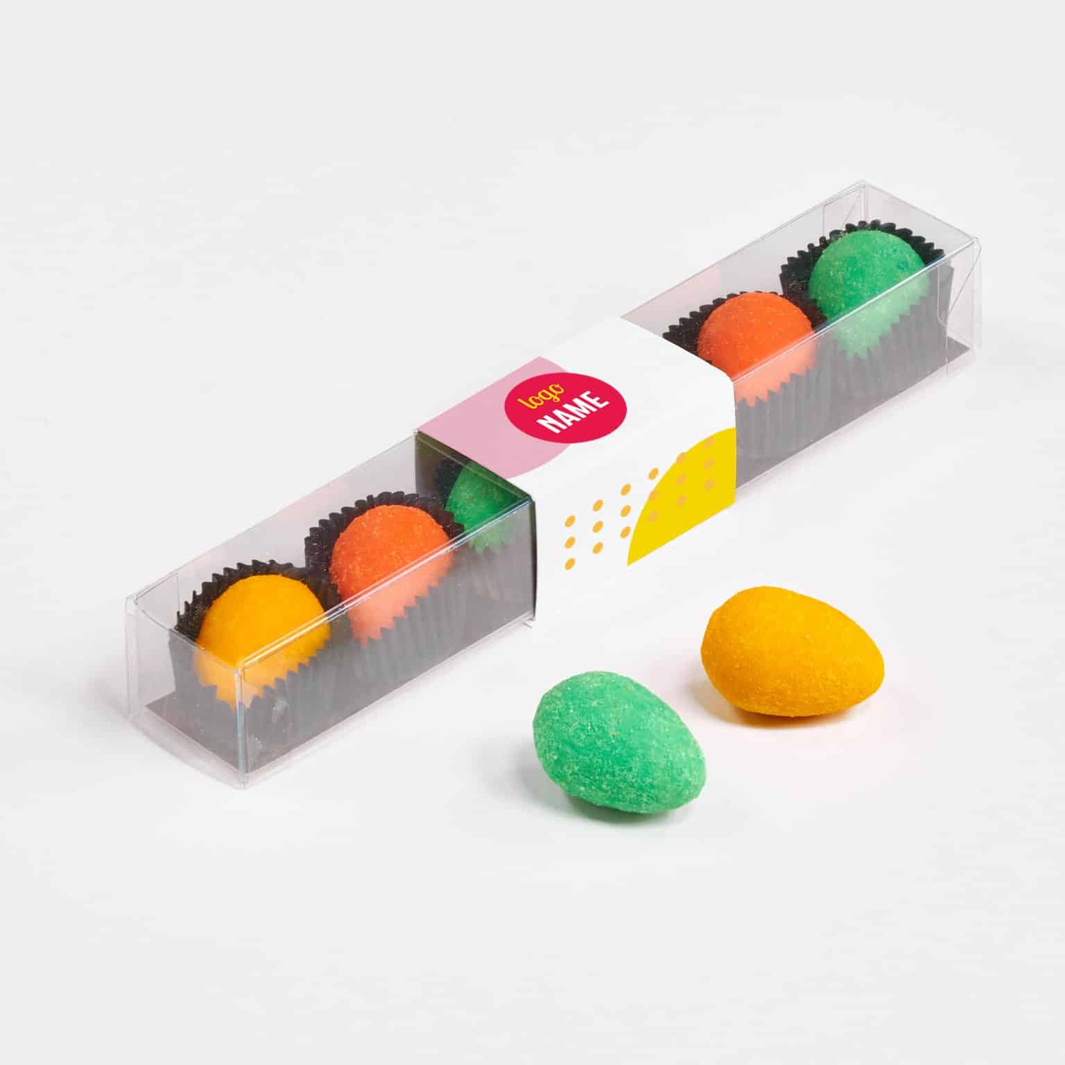 Onze chocolade paastruffels zijn bij uitstek het allerleukste paaschocolade geschenk wat je kan vinden! De verpakking met 6 chocolade truffels van elk 85 gram worden geleverd in de smaken “vanille” (rood), “toffee” (geel) en “caramel-zeezout” (groen). De verapkking is 20 x 3 x 2.8 cm en wordt geleverd in een kunststof doos met een 400 grams silk kartonnen sleeve die wij full-color leveren. Wil je zelf een ontwerp maken? Download de werktekening en ga helemaal los met het ontwerp!