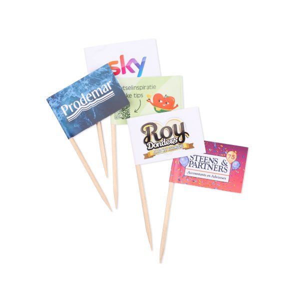 Zoek je naar cocktailprikkers bedrukken of wil je kaasprikkers met logo laten maken? Het gaat allemaal om hetzelfde product! Wij zorgen voor een haarscherpe bedrukking op stevig papier, bevestigd aan een houten prikker. Kies uit een eenzijdige of dubbelzijdige bedrukking in full-color. Zo krijg je altijd een product dat bij jouw wensen past.